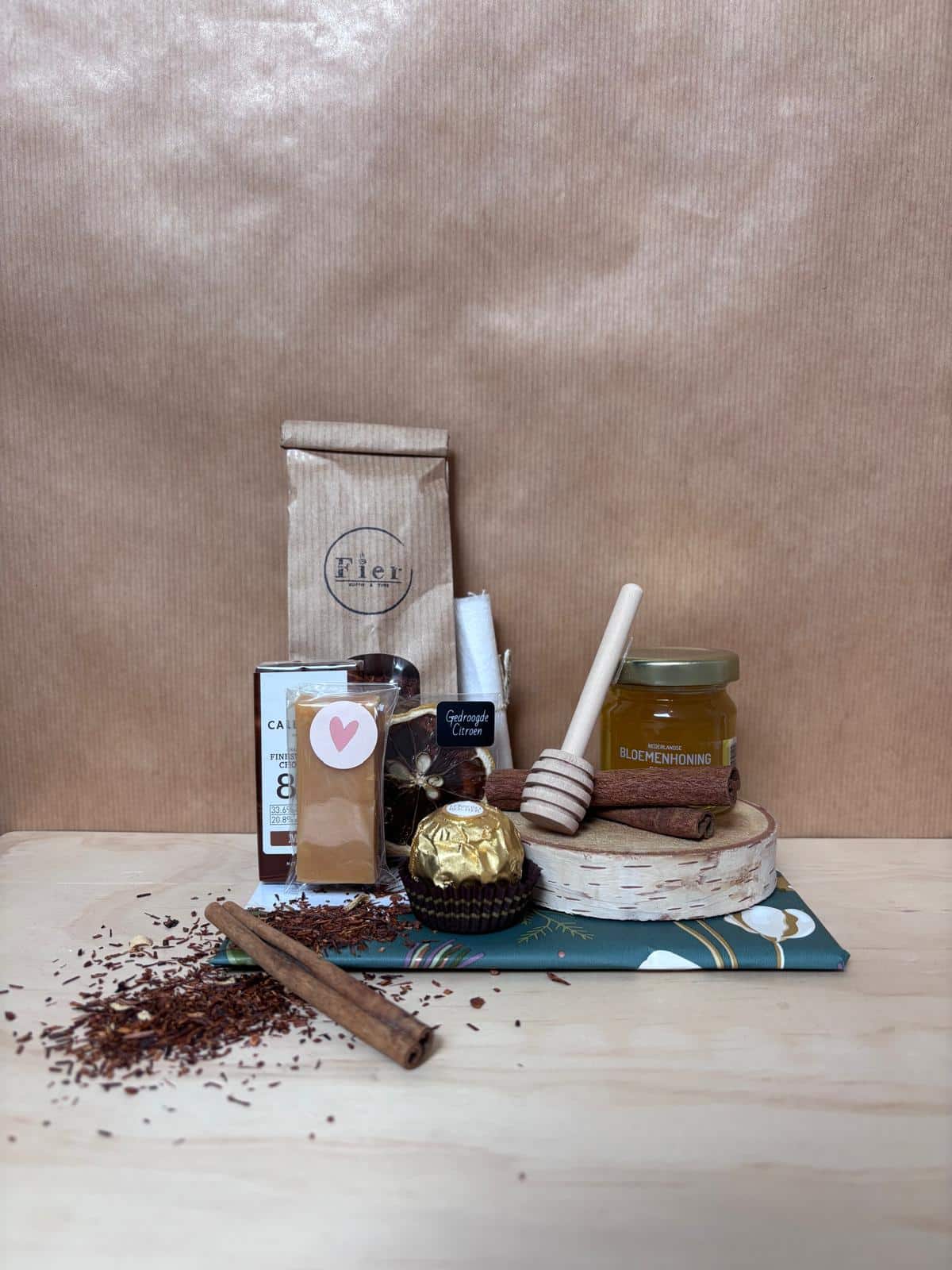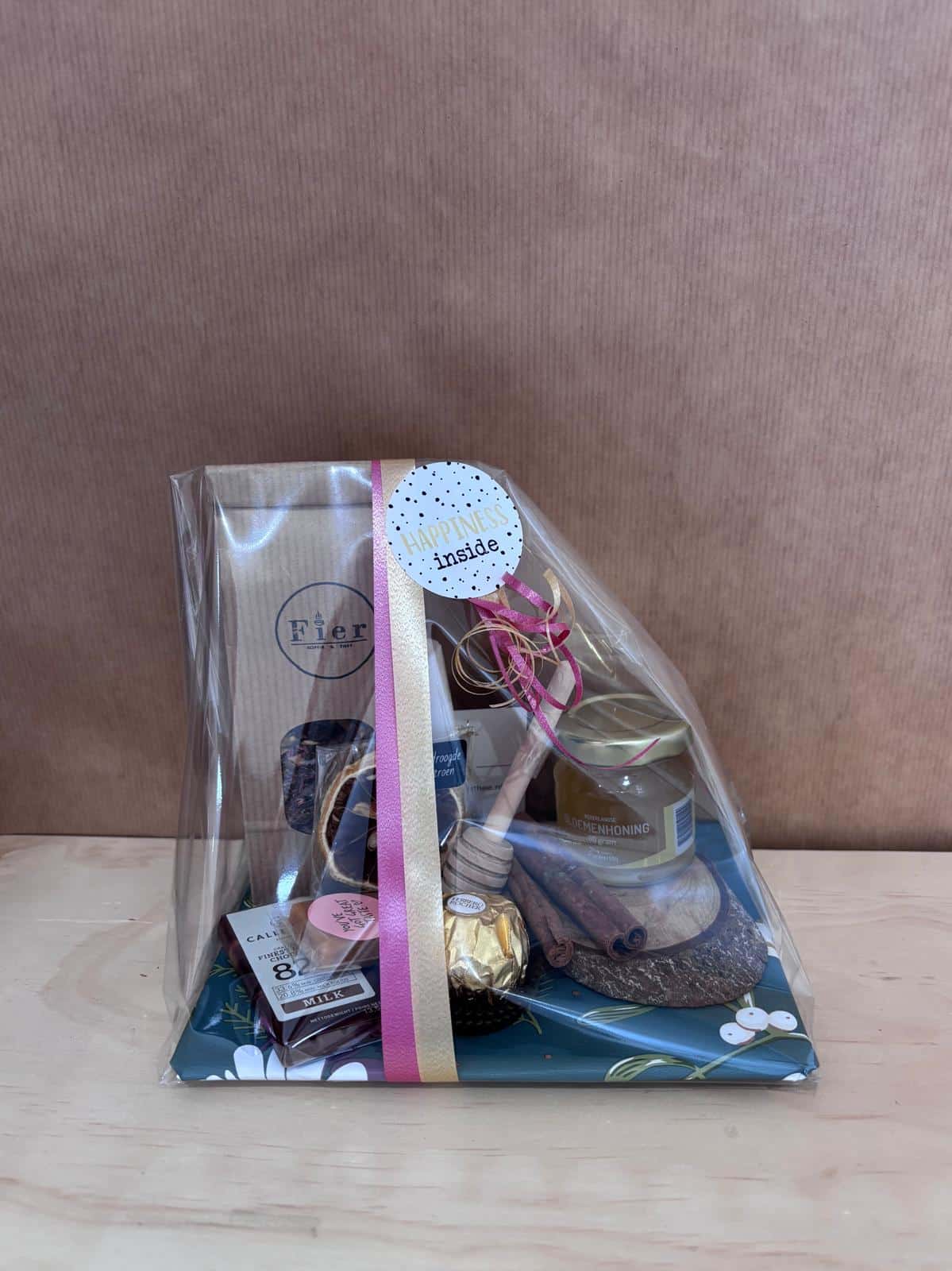 Dit pakket bevat een zakje rooibos, een potje pure honing (van de Werkbij), een houten honinglepel en lekkernijen zoals chocola en caramel.